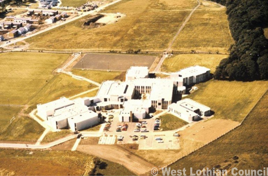 This is an aerial image of Deans Community High School shortly after its opening in 1978.   This school was the first in Scotland where adults joined children in the classrooms.