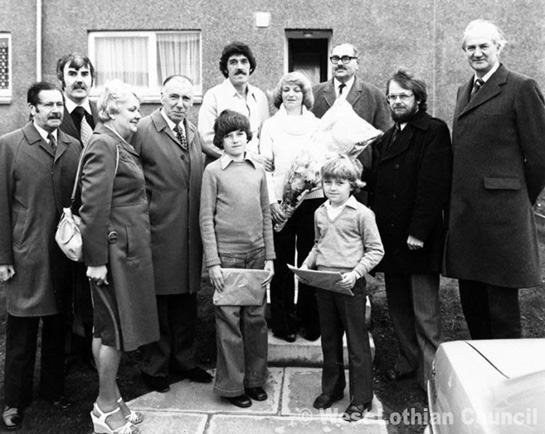 This photograph shows some members of the LDC Board and Directors welcoming John and Violet Smith who moved into Livingston's 10,000th house in the Deans area with their two sons in November 1978.