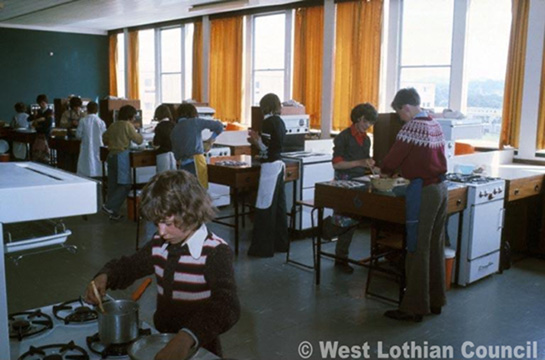 This photograph shows a cookery class going on in Craigshill High School. The classroom was well supplied with modern gas and electric cookers. Notice that the teacher can be seen in the background wearing a white coat.